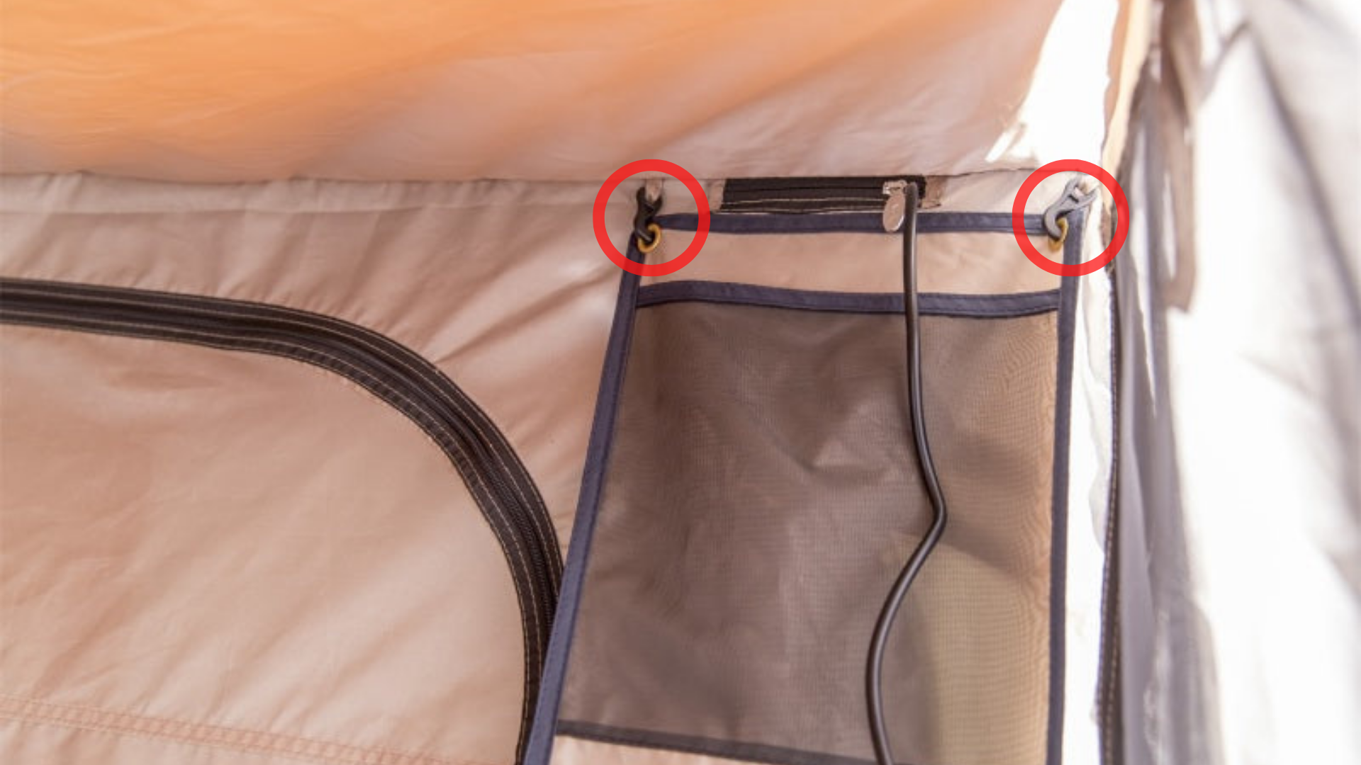 9. On the left and right walls of the awning room you will see multiple open-ended hooks. Clip those hooks over the horizontal poles until they fully seat. Apply some pressure while also supporting the awning pole.